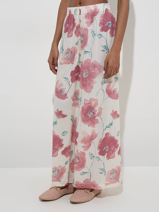 Zuba Dusty Pink Floral Design Cotton-Blend Palazzos