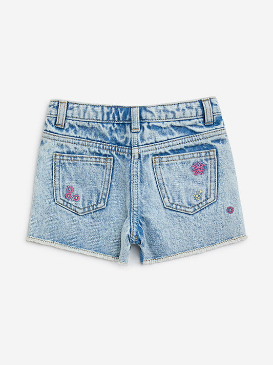 HOP Kids Light Blue Floral Design High-Rise Denim Shorts