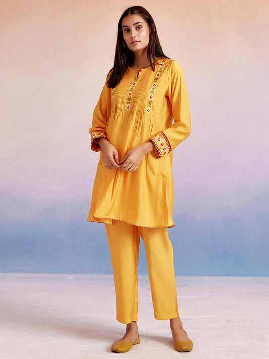Mustard Embroidered Leheriya Kurta With Dhoti