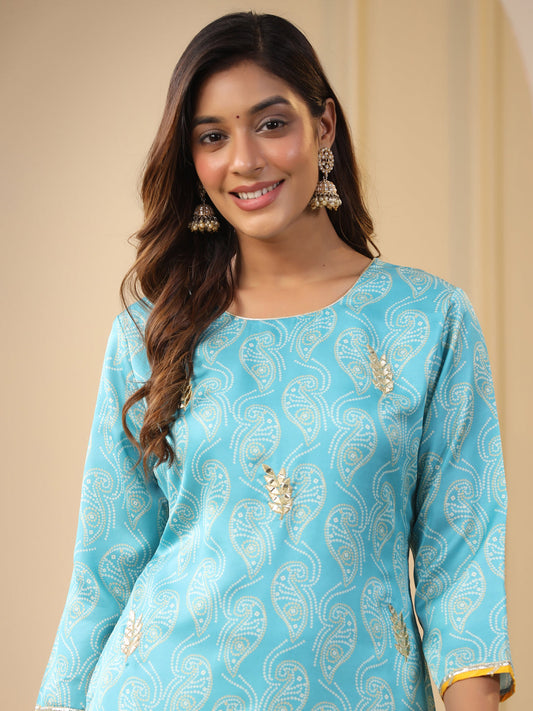 Regular price Rs. 2,079.00Regular priceUnit price / perRs. 5,199.00Sale price Rs. 2,079.00Embroidered Art Silk Blue Printed Straight Kurta With Cream Pants