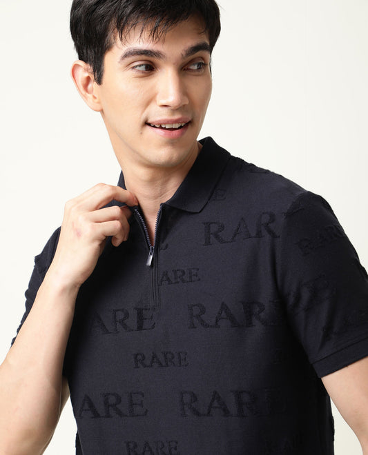 Rare Rabbit Men'S Gesset Dark Navy Polo Cotton Fabric Collared Neck Half Sleeves Zipper Closure