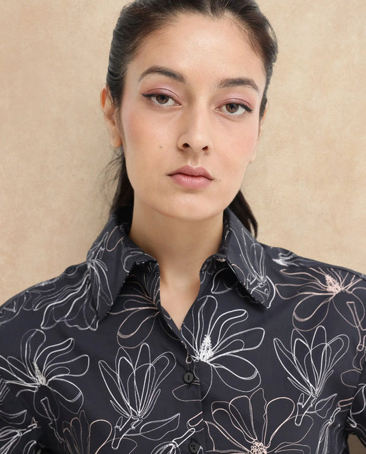 Rareism Women Reynosa Black Cotton Fabric Bishop Sleeves Jonny Collar Floral Print Relaxed Fit Cropped Shirt