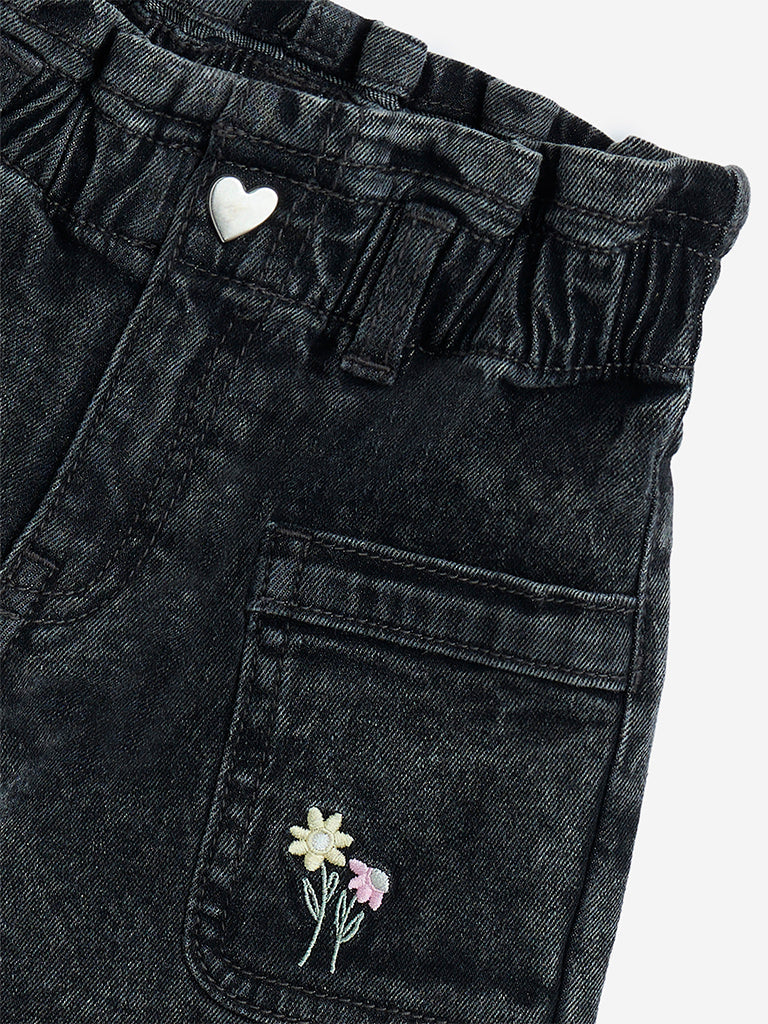 These charcoal denim shorts from HOP Kids are a stylish blend of comfort and charm. Made from pure cotton, they feature a mid-rise fit with a ruffled buttoned waistband and classic zipper fly. Delicate floral embroidery adds a playful touch, while multiple pockets make them perfect for everyday adventures.