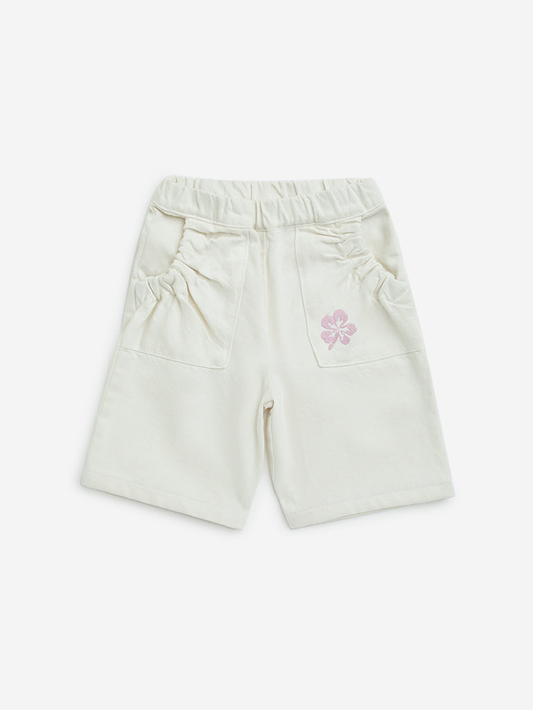 HOP Kids introduces this off-white shorts, built from cotton-rich material, in a high-rise waist. It is fitted with a smooth elastic waist for a flexible feel and side pockets with ruched details, highlighting a floral embroidered motifs as a finishing touch.