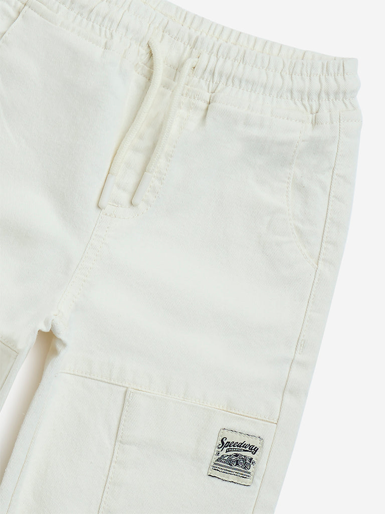 HOP Kids introduces these white jeans, constructed from pure cotton for everyday comfort. Designed with an elasticated drawstring waistband for a custom fit, they also feature multiple pockets for added functionality.