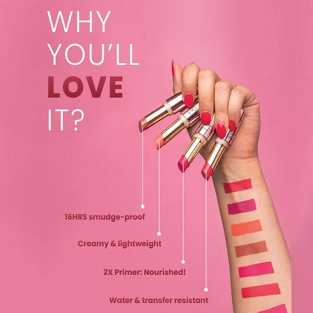 Introducing Lakmé 9to5 Primer+Matte Lipstick, with 2x built-in primer that gives your lips a long-lasting, smooth matte finish. The built-in primer ensures that the color settles onto your lips evenly. With 14-hour long stay power, it is your perfect companion in conquering the day! Now say goodbye to touch-ups through the day, as this lipstick was made for the woman who doesn’t stop! Available in 20 intensely rich, matte shades, your search for the perfect color ends with Lakmé 9to5 Primer+Matte Lipstick. Choose from a wide range of nudes, pinks, reds, browns, and plums that deliver rich color without drying out your lips. It glides on smoothly for a flawless matte finish and a vibrant color payoff. Look good and feel unstoppable as you put on your makeup.