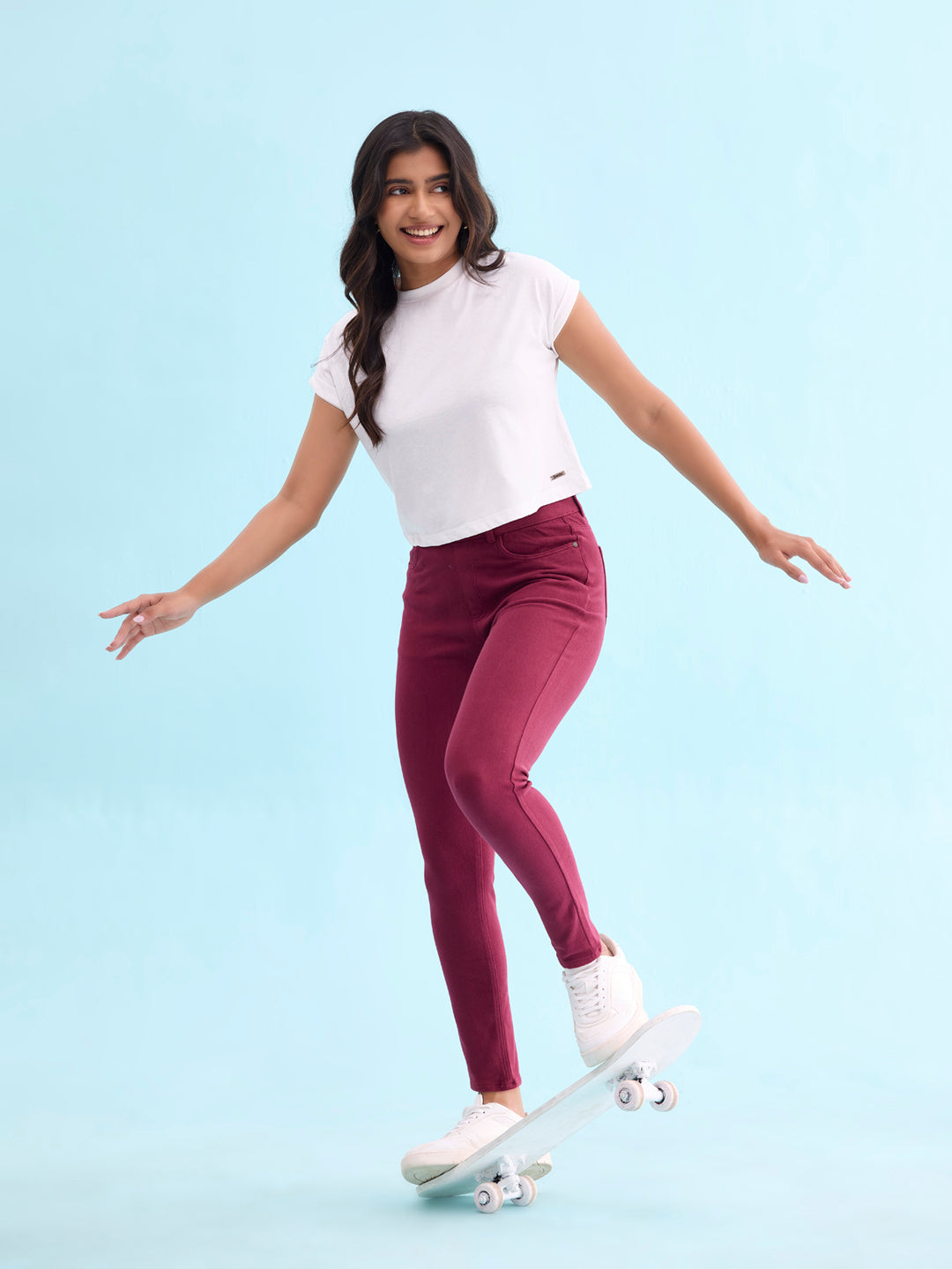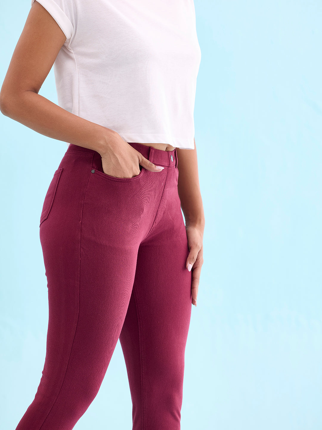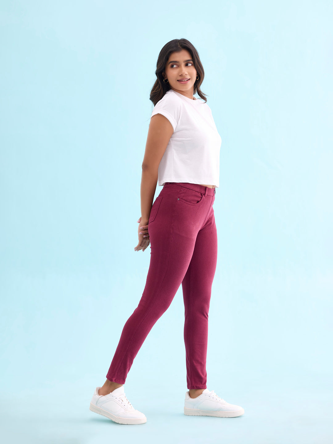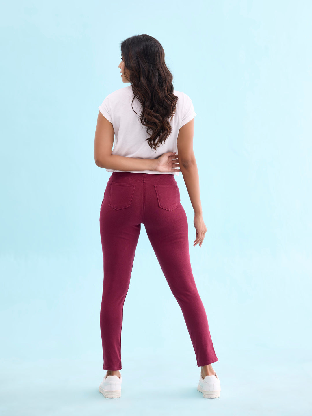 Stay warm this winter in the Solid Maroon Ultra Warm Jeggings. Made from cotton & polyester, this mid rise slip jeggings with 4 pockets & elasticised waistband are perfect for cozying up this winters.