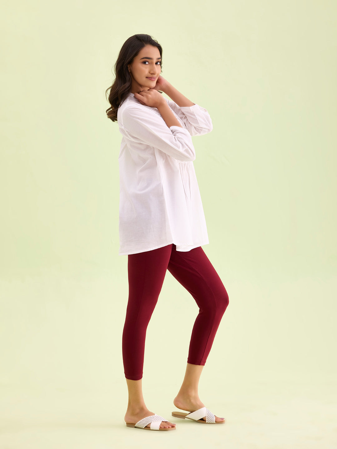 Go the ethnic way with our Solid Maroon Cropped Leggings. Made from Cotton & Elastane, it has a elasticised waistband, slim fit & is of 7/8th length.