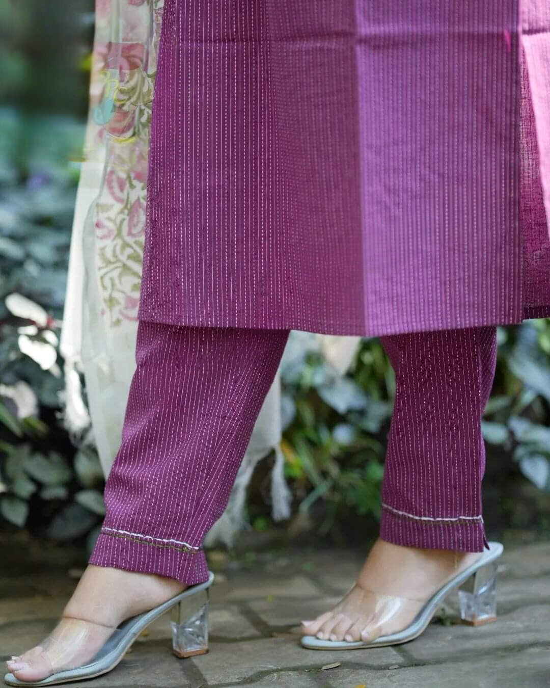 Purple Embroidered Katha Cotton Suit Set with Kota Dori Dupatta