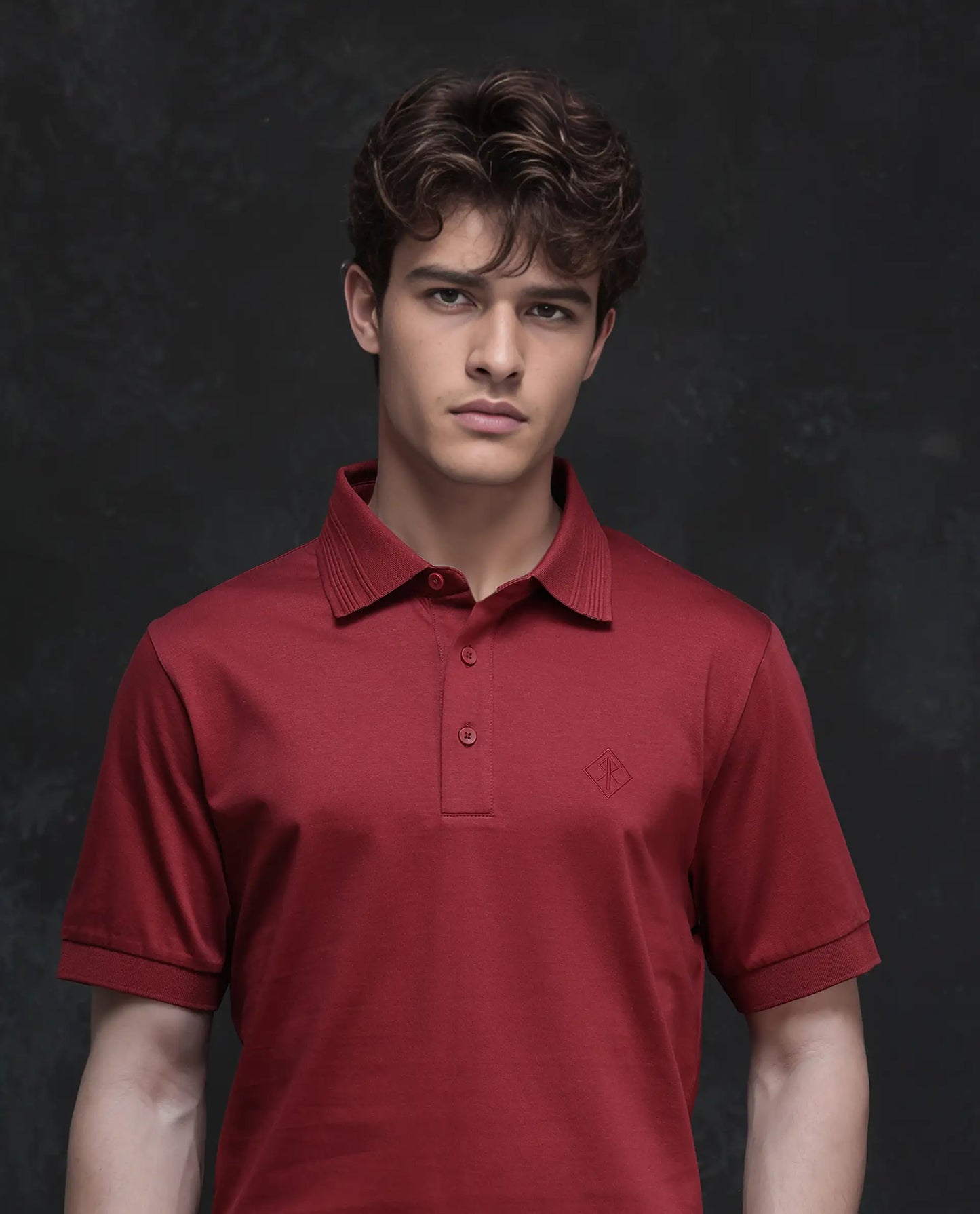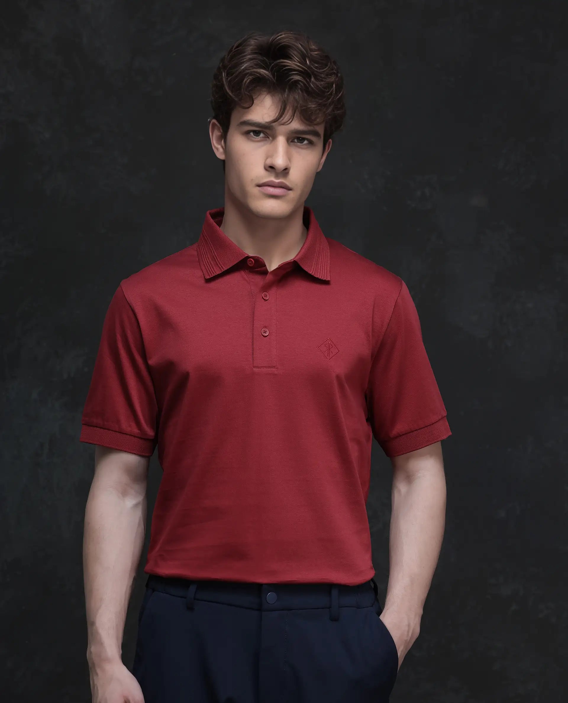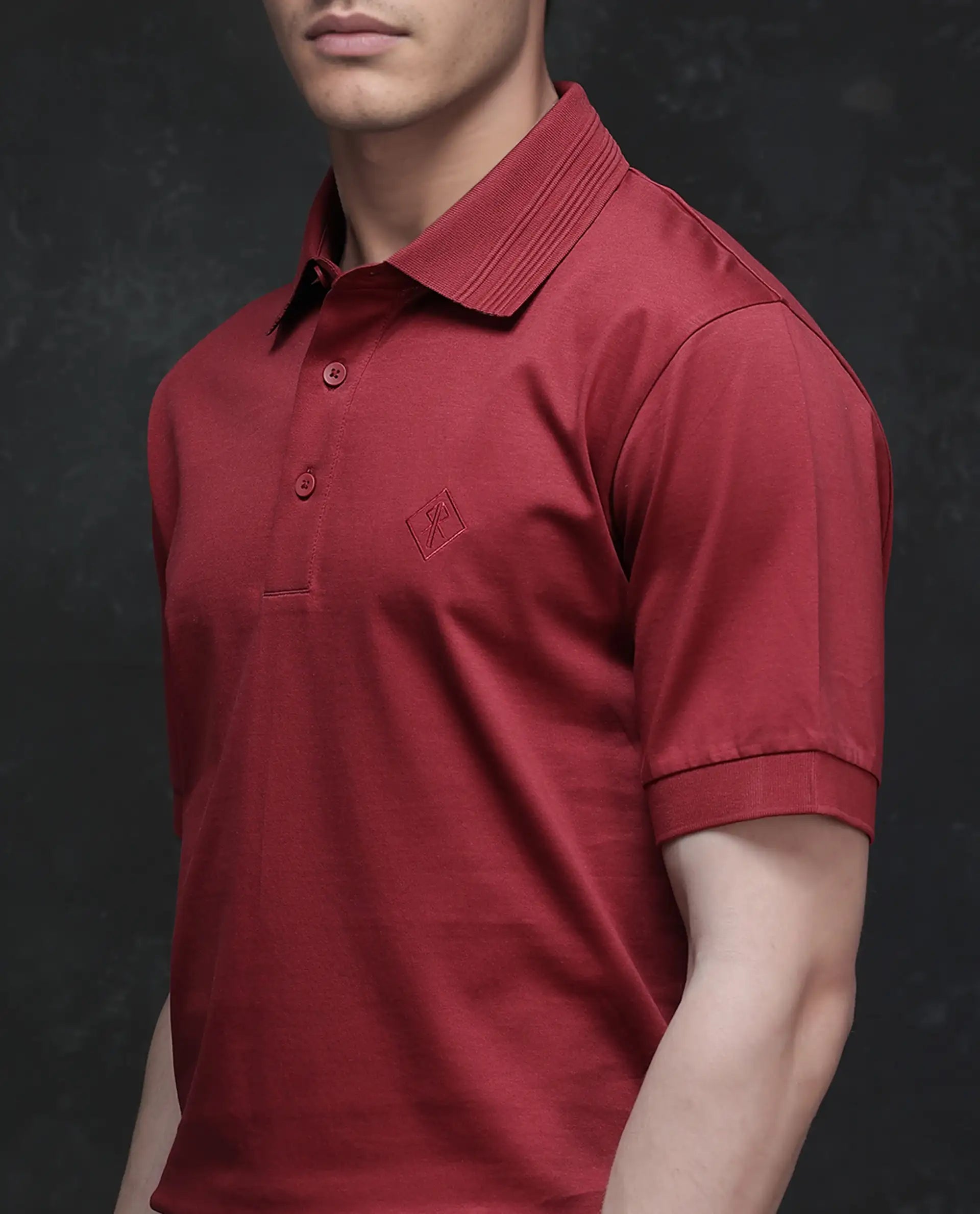 Rare Rabbit Men Ripl Red Cotton Fabric Short Sleeve Collared Neck Button Closure Plain Polo