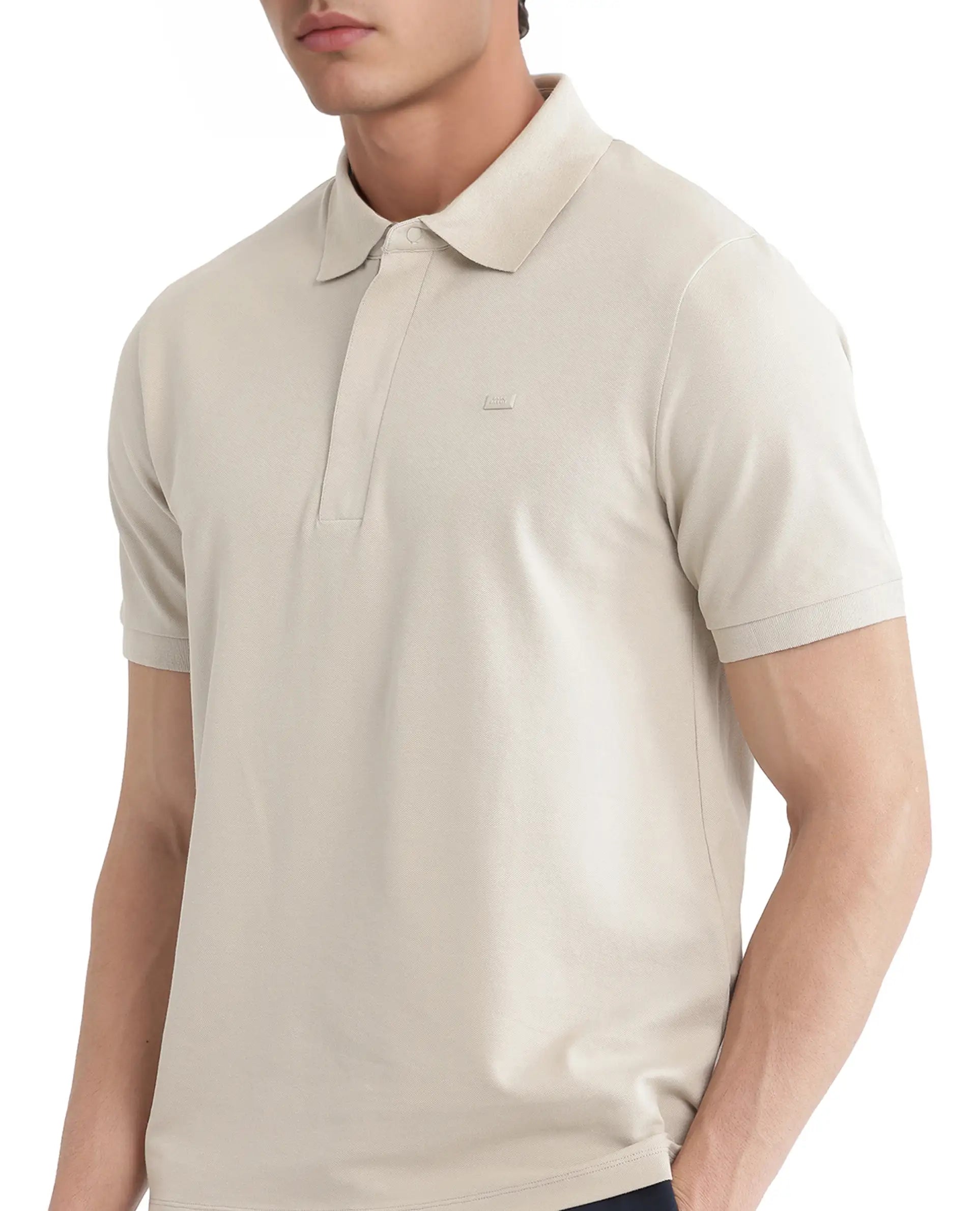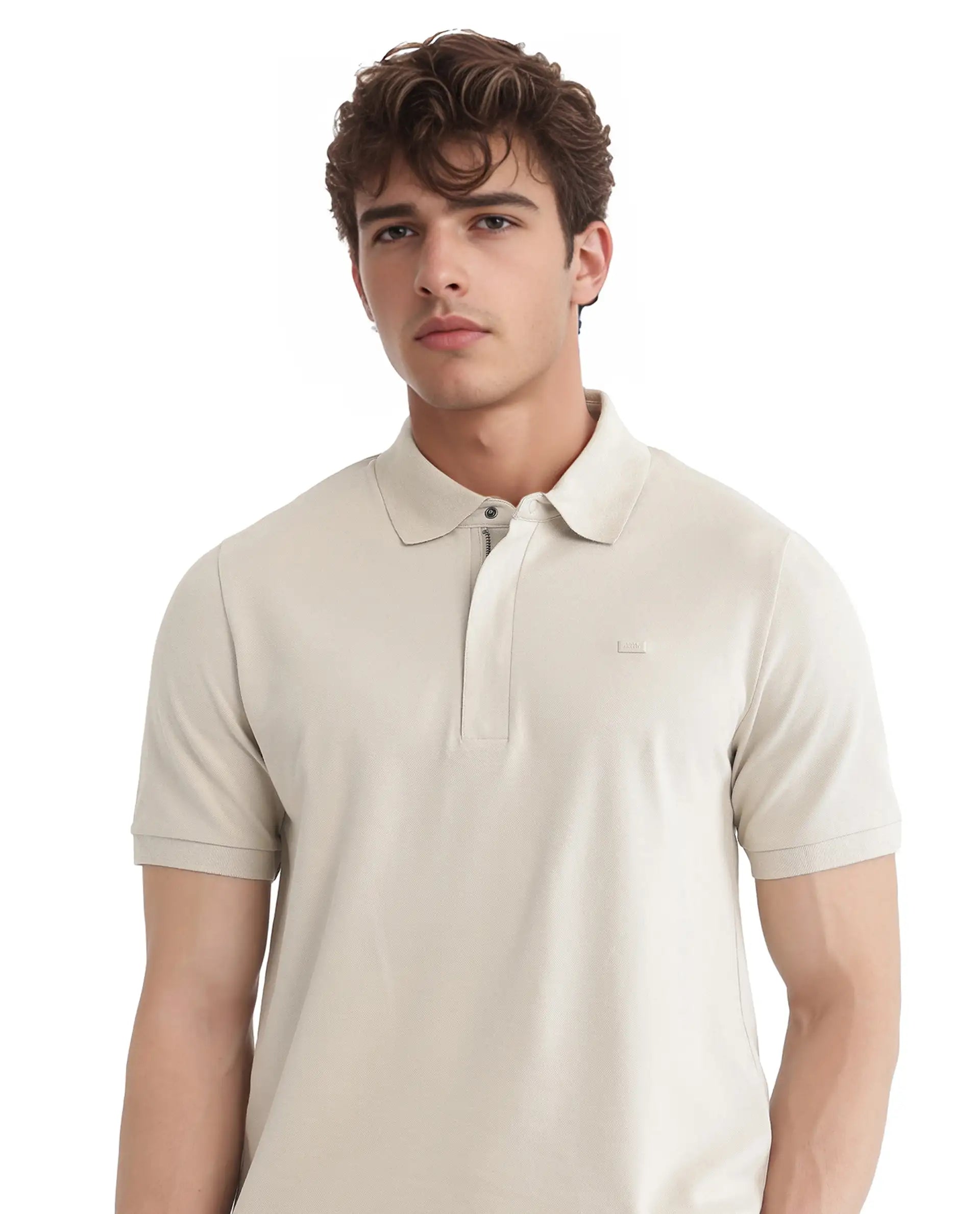 Rare Rabbit Men Salis-25 Beige Cotton Blend Fabric Short Sleeve Collared Neck Zipper/Snap Closure Plain Polo