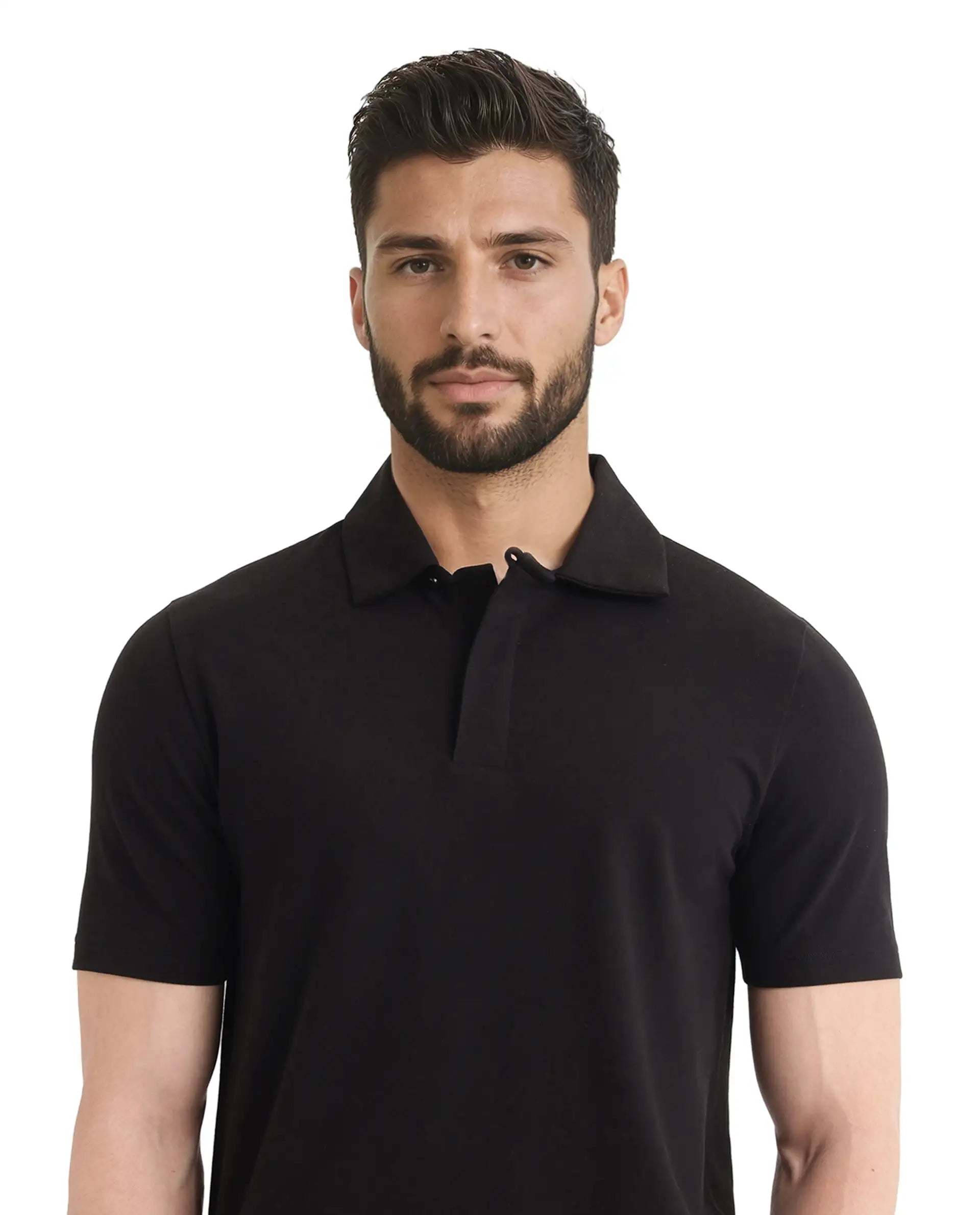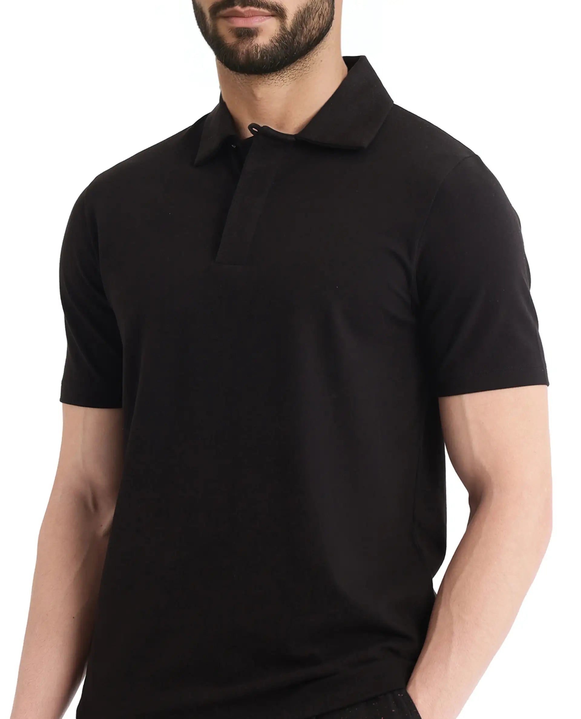 Rare Rabbit Men Zeni Black Cotton Lycra Fabric Short Sleeve Regular Collared Button Closure Plain Polo