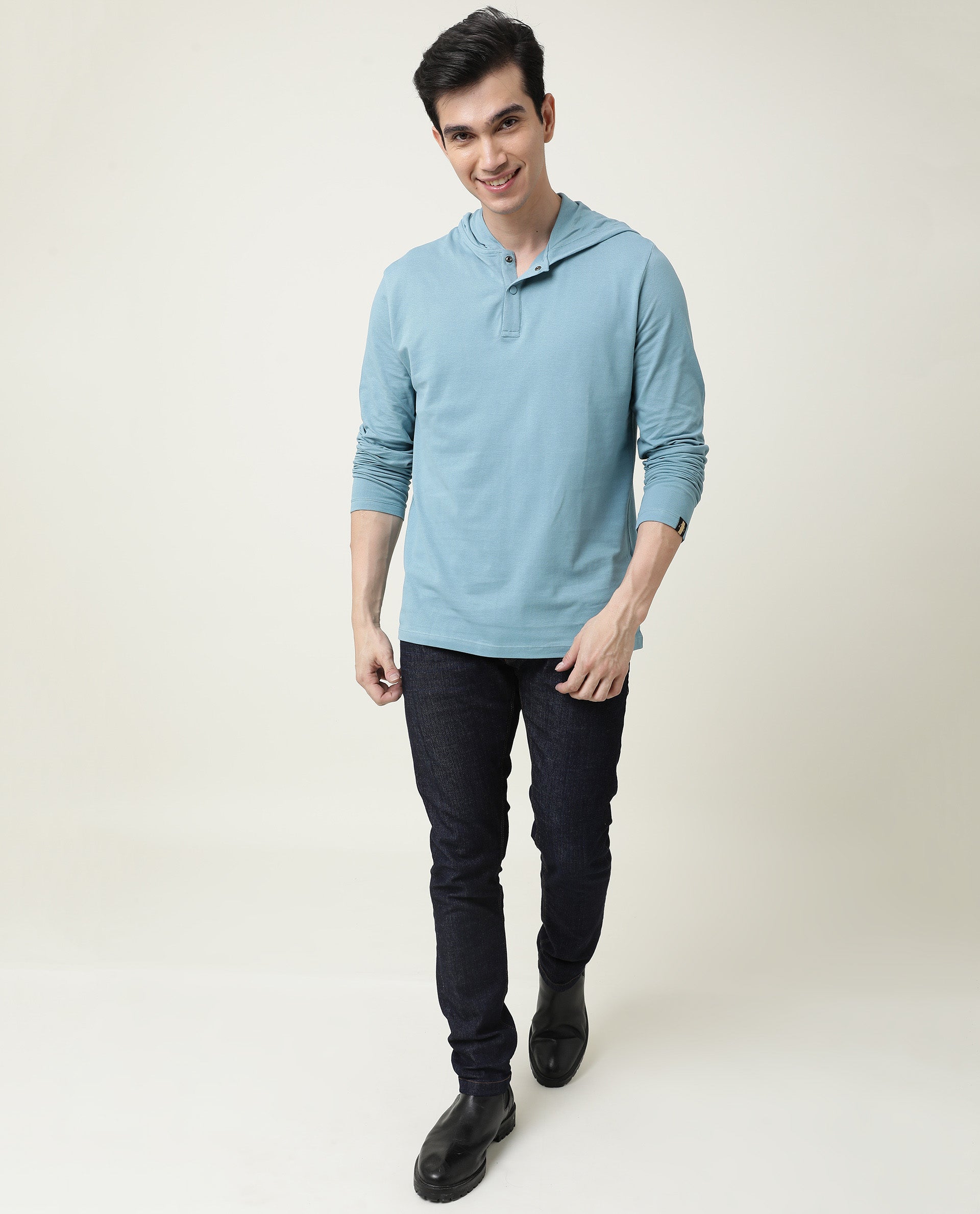 Rare Rabbit Men's Hoods Green Cotton Fabric Long Sleeves Hooded Polo T-Shirt