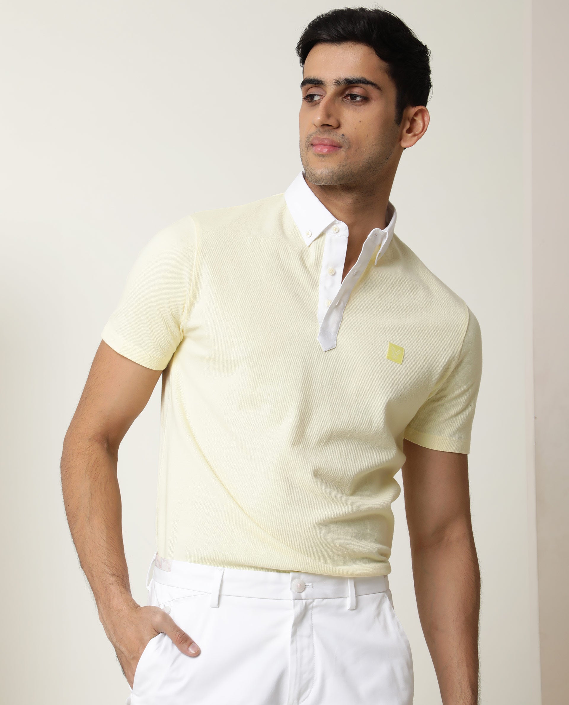 Rare Rabbit Men's Parma Yellow Cotton Fabric Collared Neck Half Sleeves Button Closure Polo T-Shirt
