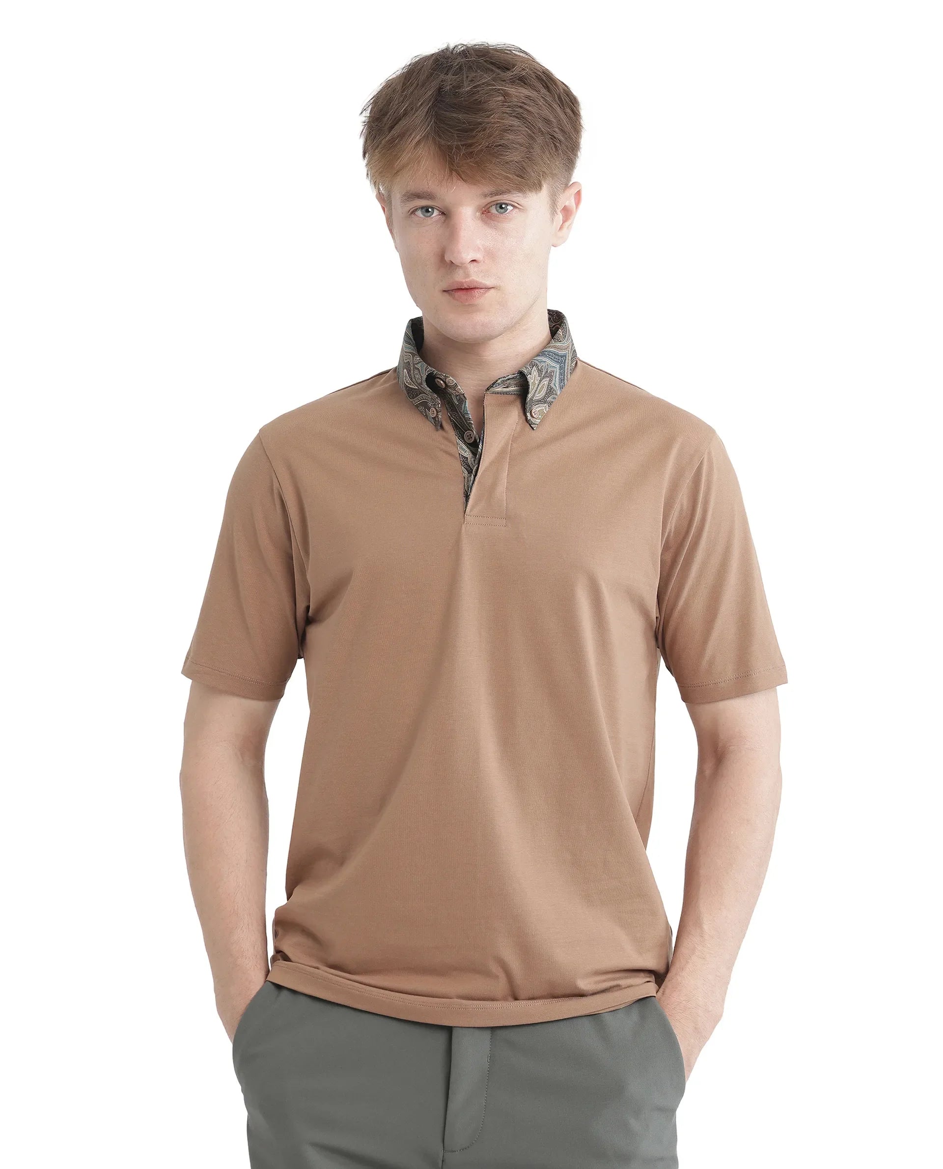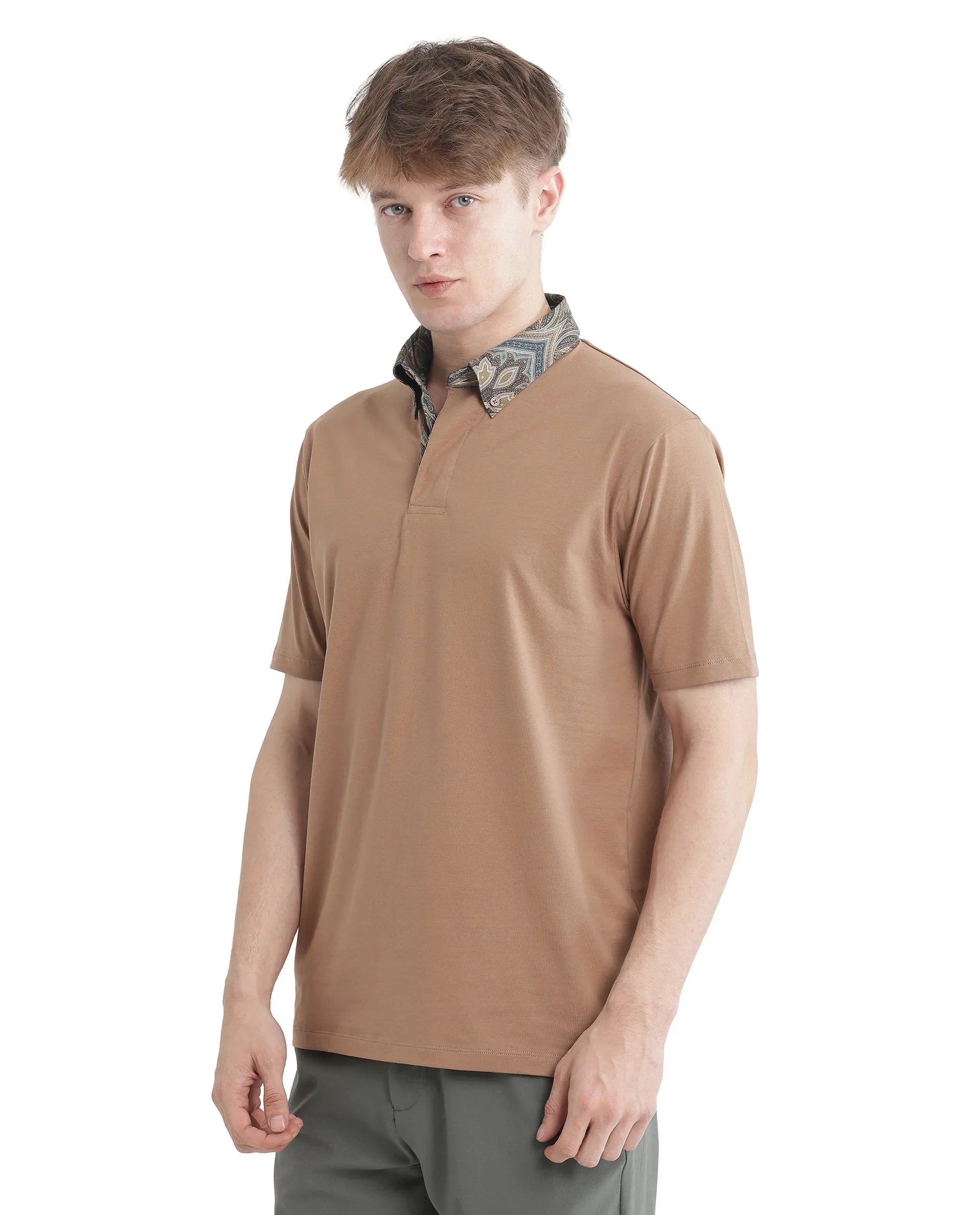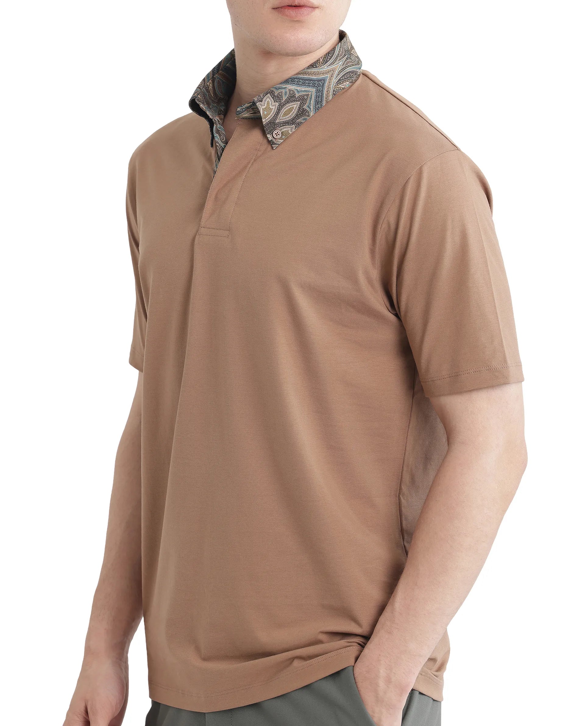 Rare Rabbit Men's Ringer 25 Dusky Beige Cotton Blend Fabric Half Sleeve Spread Collar Regular Fit Plain Polo