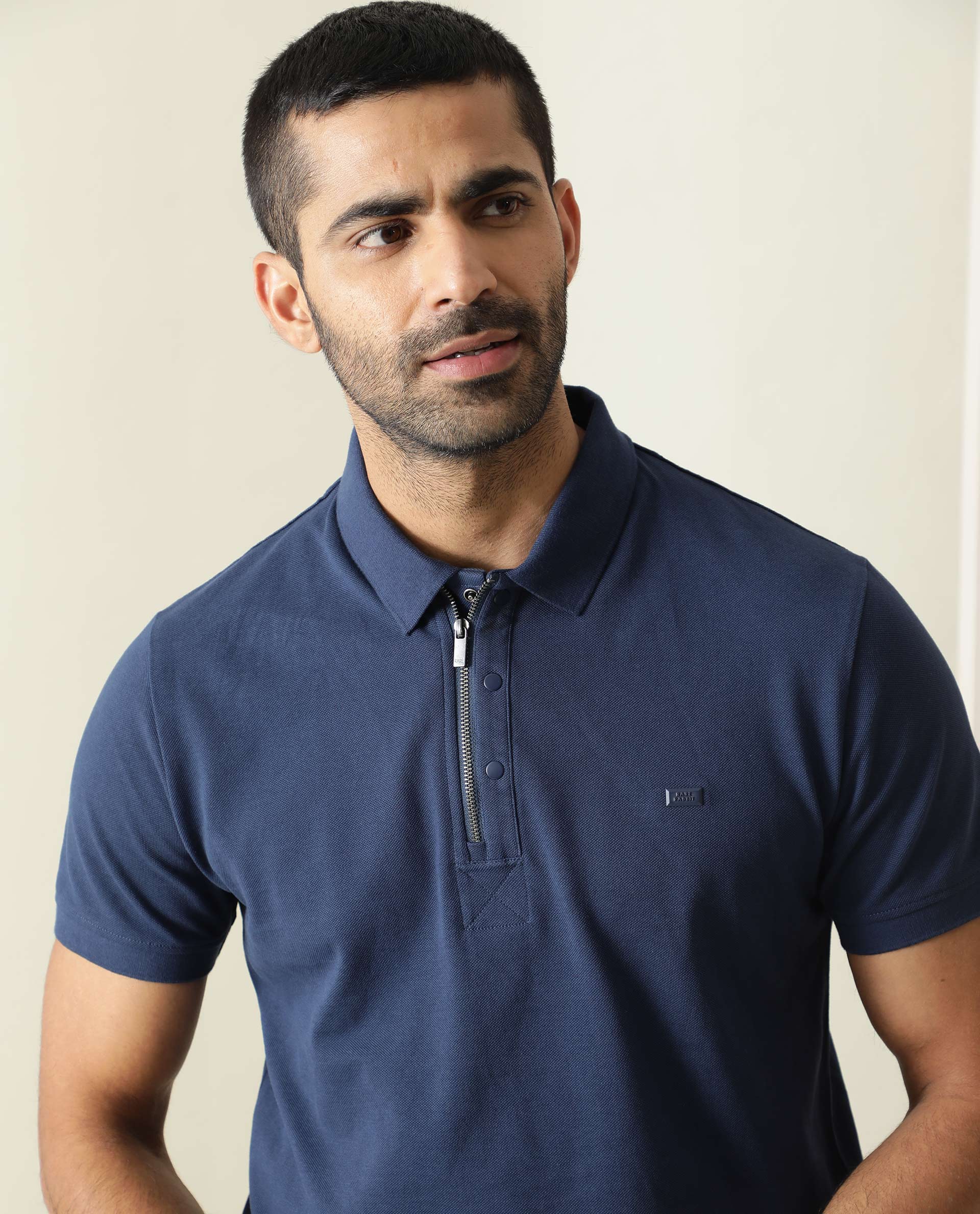 Rare Rabbit Men's Silas Blue Cotton Fabric Snap Button And Zipper Closure Collared Neck Half Sleeve Polo T-Shirt