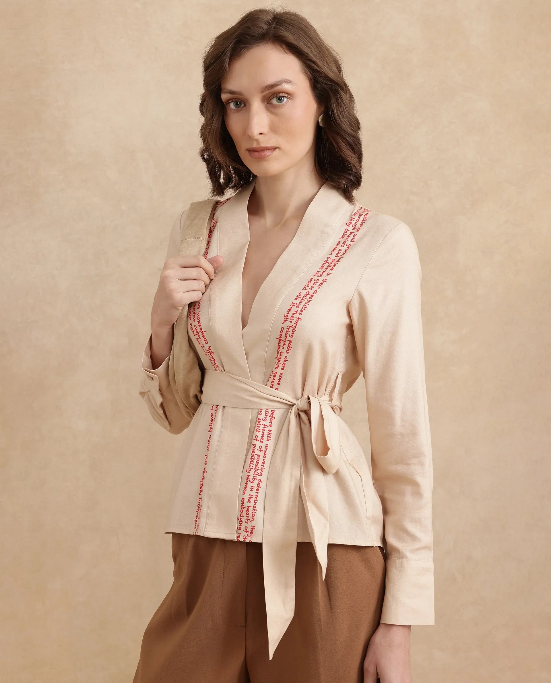 Rareism Women Juinb Beige Cuffed Sleeve Shawl Neck Regular Fit Typography Print Top
