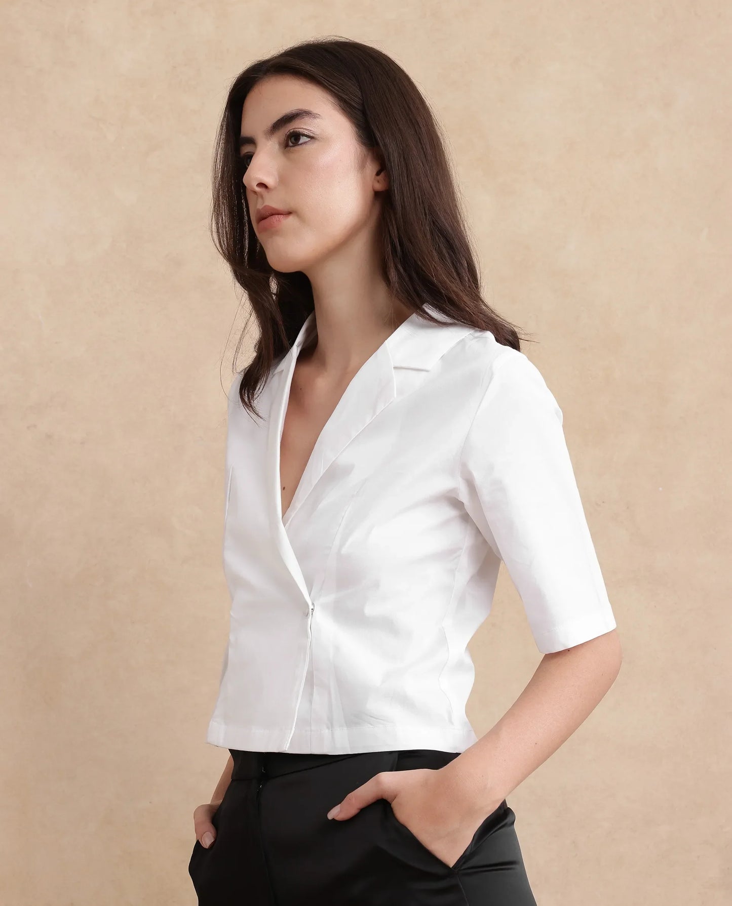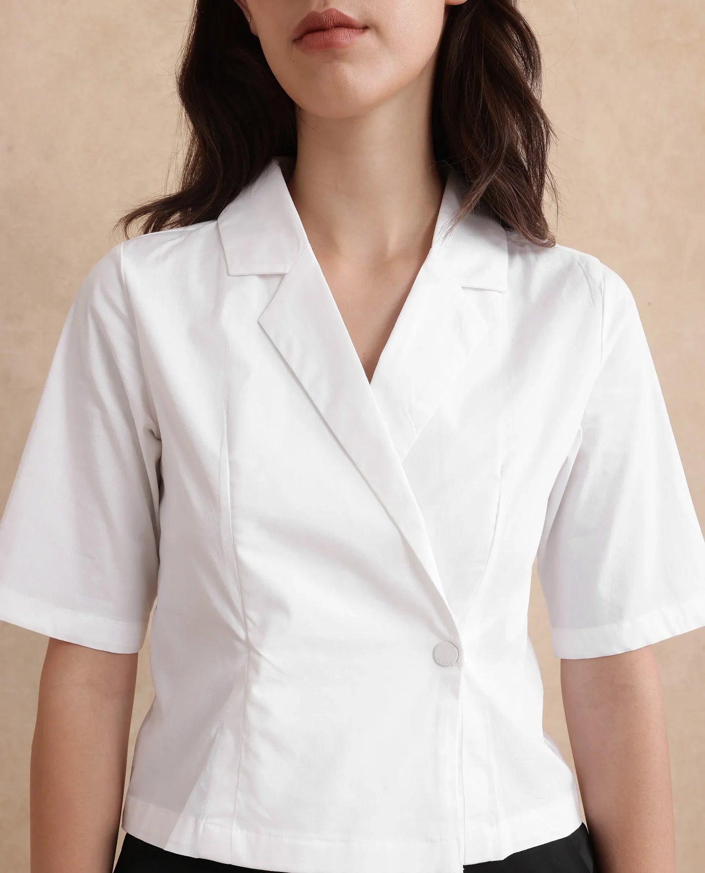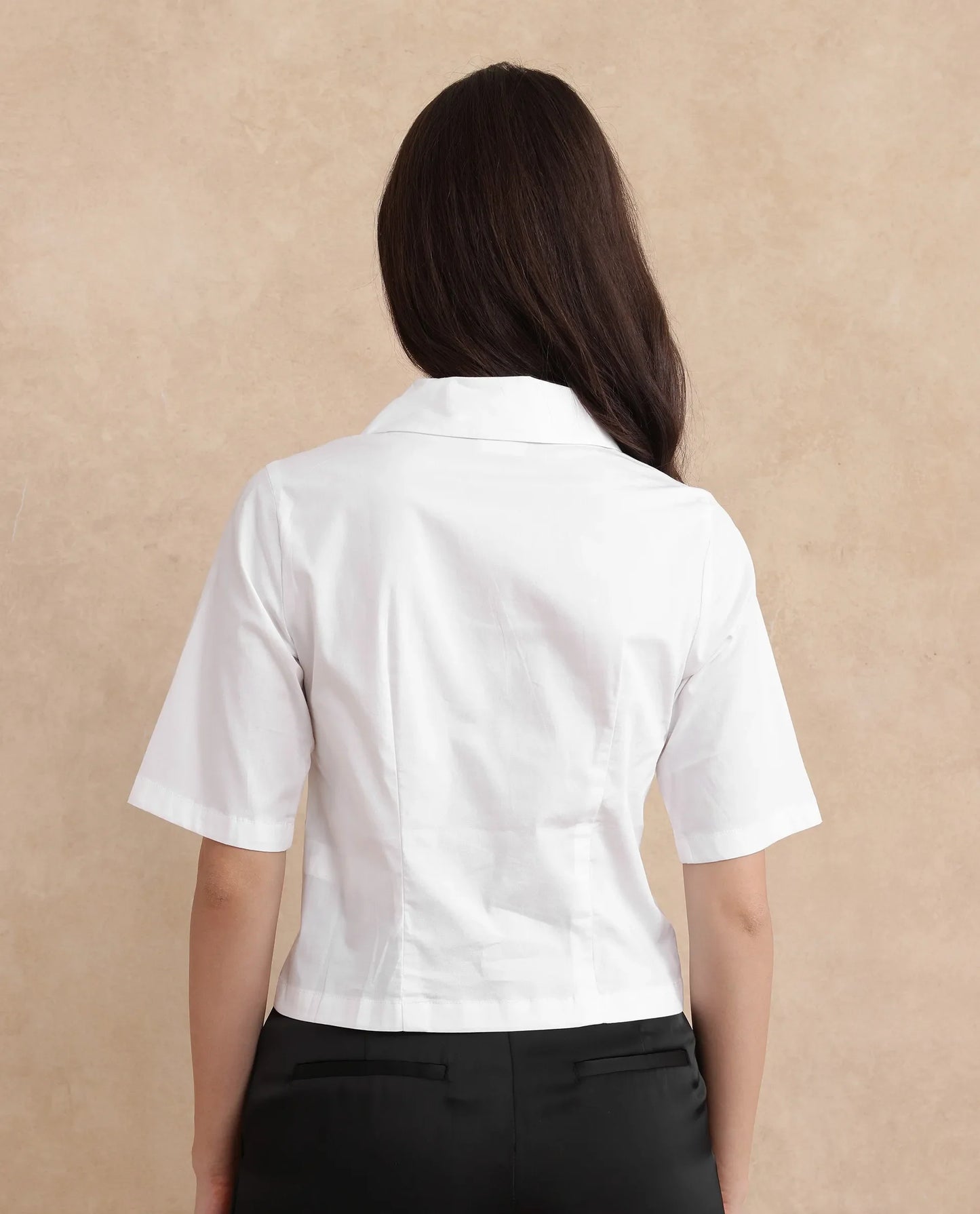 Rareism Women Seui White Short Sleeve Lapel Neck Boxy Fit Cropped Plain Top