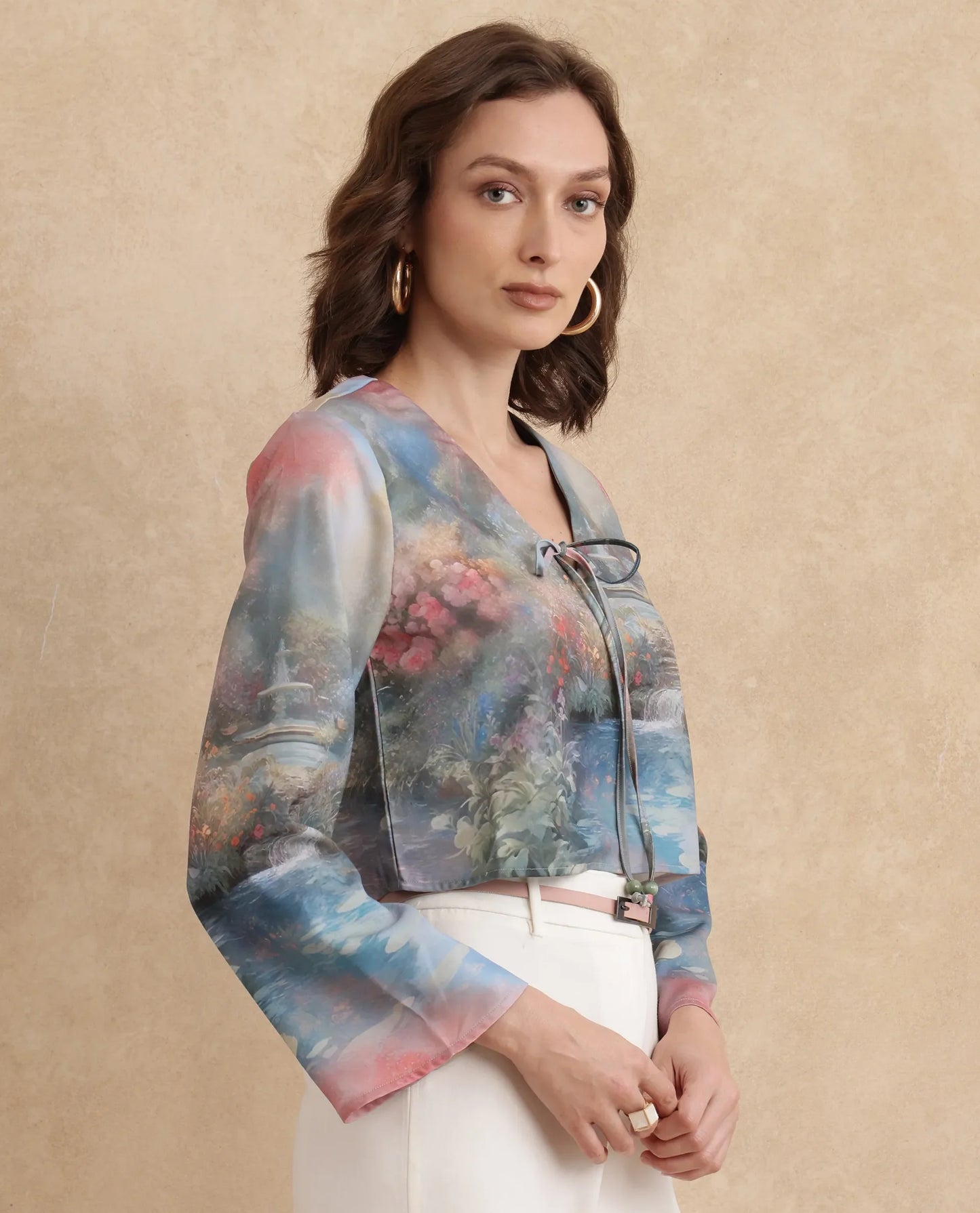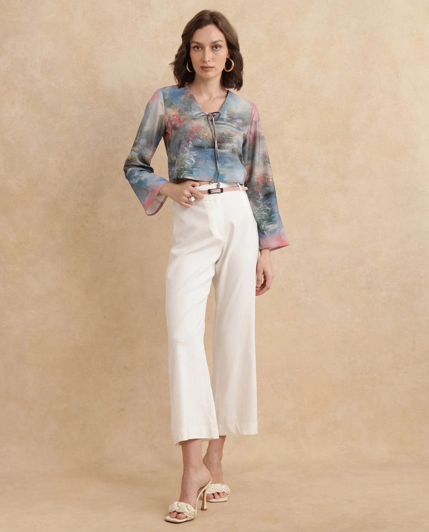 Rareism Women Toulon Multi Satin Bell Sleeves V-Neck Cropped Abstract Print Top