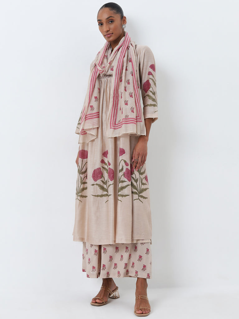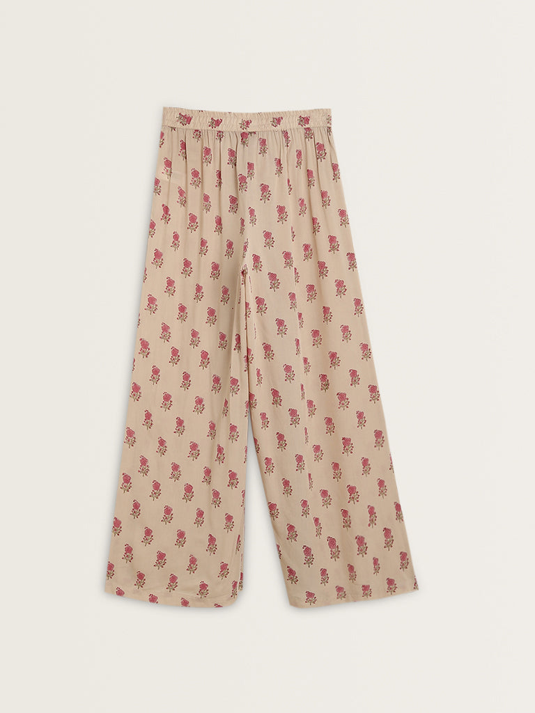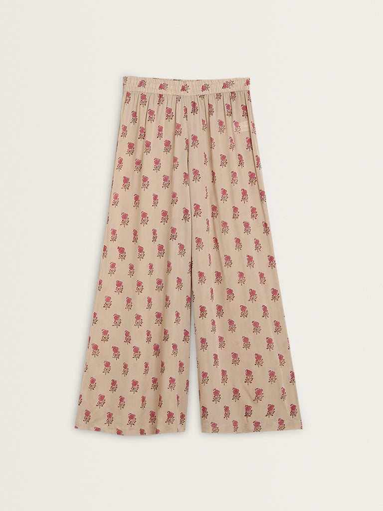 Zuba Beige Floral Printed High-Rise Palazzos