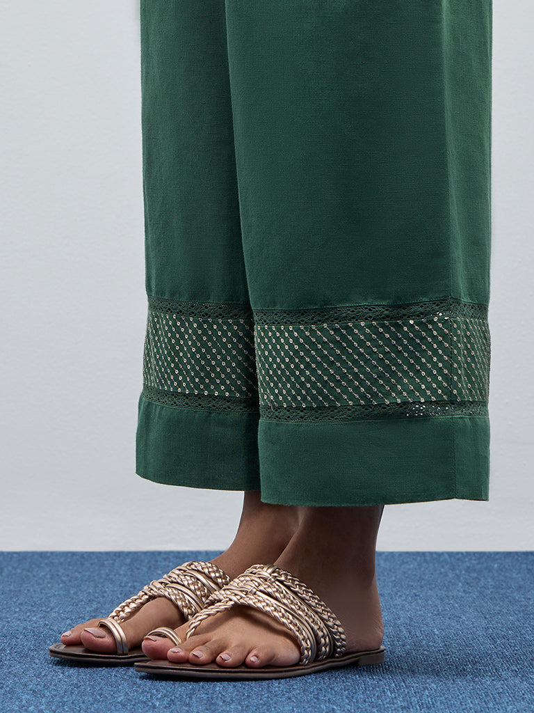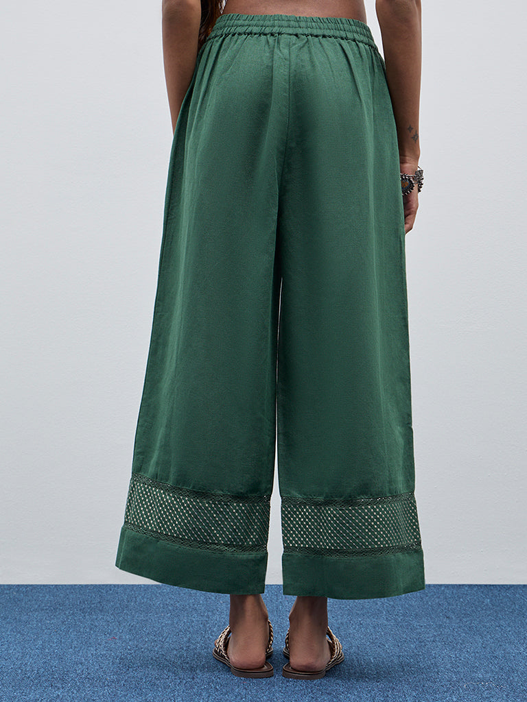 Created from a linen-blend fabric for luxurious comfort, these jade green palazzos by Zuba highlight sequin embellished detailing near the hemline. It features a high-rise elasticated waistband with attached drawstrings for a secure fit.