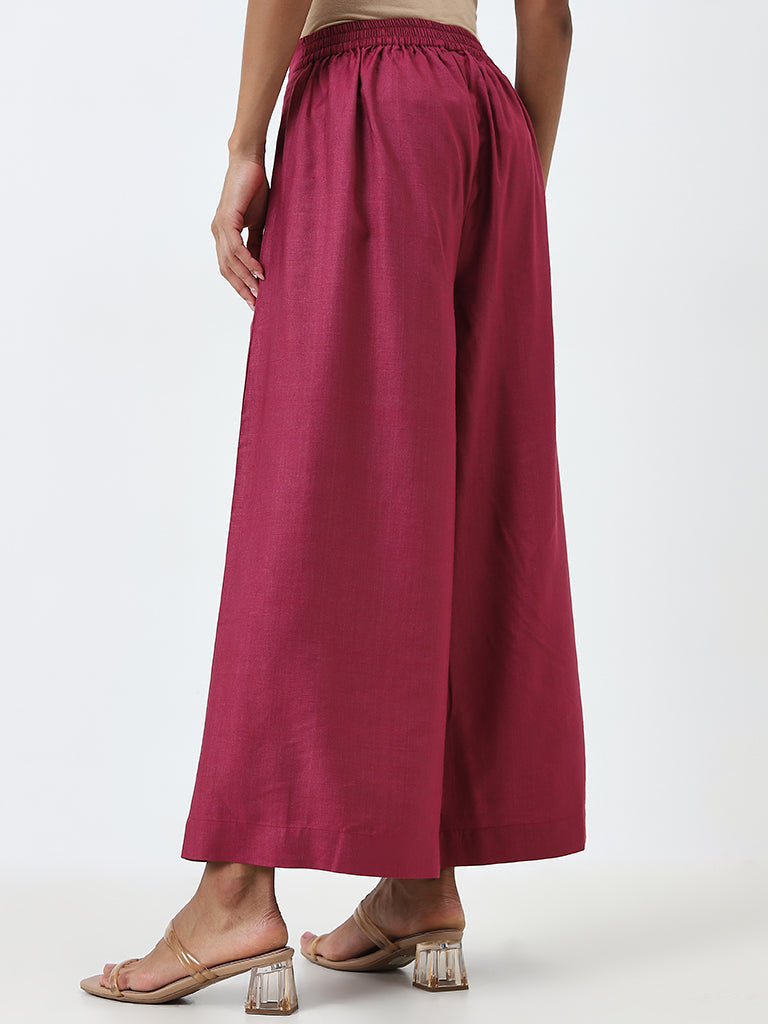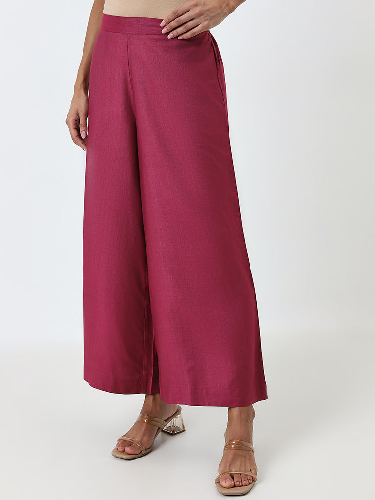 Zuba adds these magenta palazzos to its ethnic portfolio featuring a high-rise style. This luxurious pair is fashioned from a silk-blend material featuring an elastic waist and side pockets for comfort and practicality.